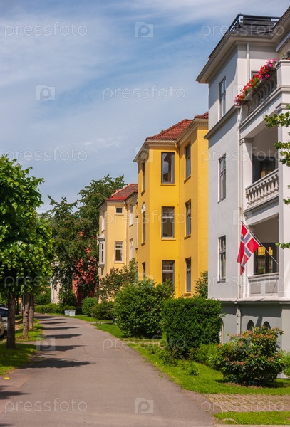Вид на тихую и уютную улочку норвежской столицы с разноцветными домами. Осло, Норвегия