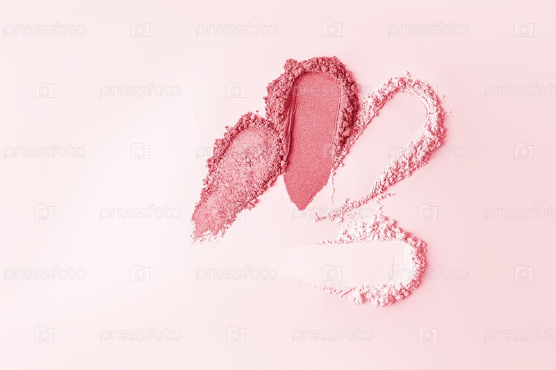 Несколько образцов рассыпчатых румян разных тонов на пастельном фоне. Копировальное пространство. Макет, образец для дизайна текстуры и рекламы