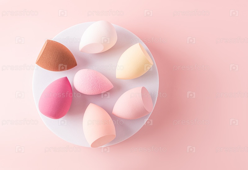 Несколько косметических спонжей в форме яйца, блендер для макияжа на круглом белом подиуме. розовый фон. инструменты для макияжа. вид сверху. Копировальное пространство