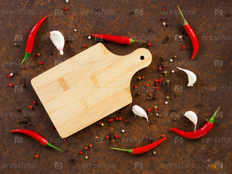 Стручки и горошины красного острого перца чили, разделочная доска, зубчик чеснока на темном ржавом металлическом фоне, вид сверху, место для копирования