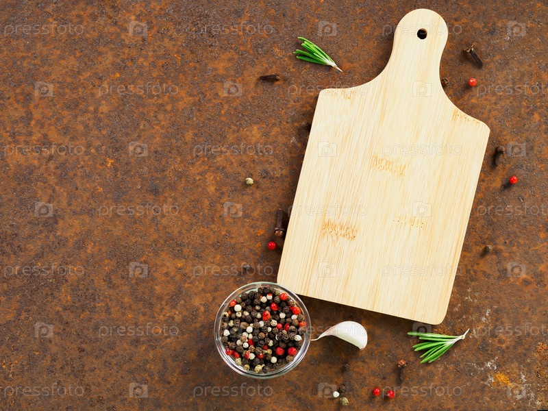Разделочная доска и приправа, зубчик чеснока на темном ржавом металлическом фоне, вид сверху, место для копирования