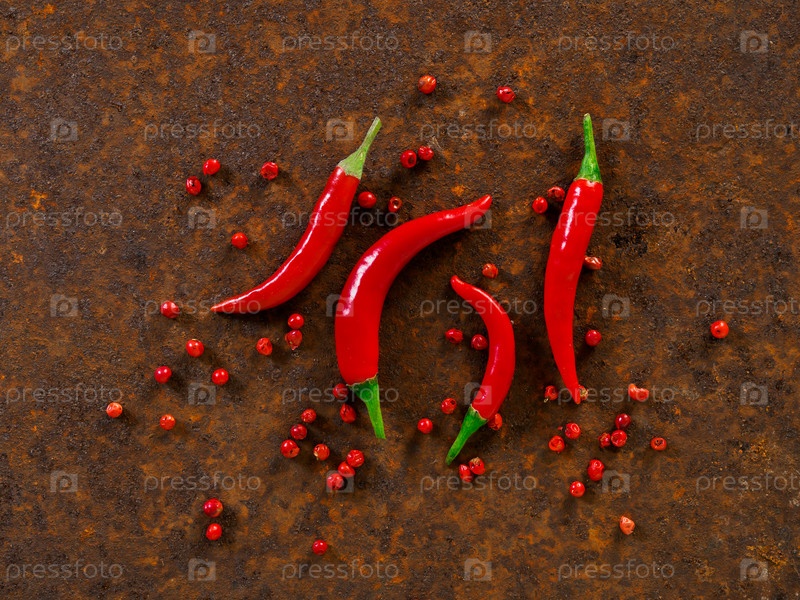 Стручки и горошины красного острого перца чили на темном металлическом ржавом фоне, вид сверху