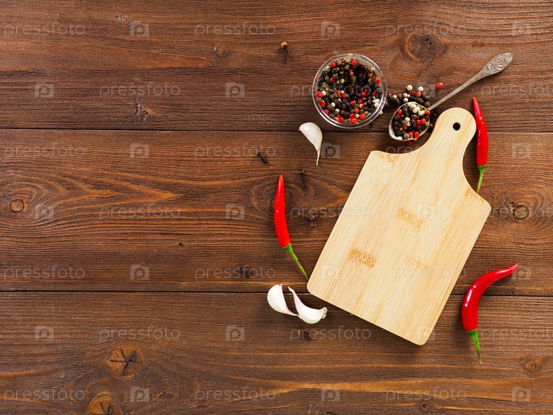 Стручки и горошины красного острого перца чили, разделочная доска, зубчик чеснока на коричневом темном деревянном фоне, вид сверху, место для копирования