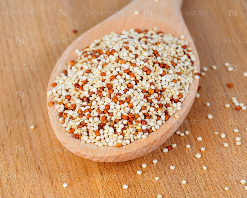Куча киноа в деревянной ложке на деревянном фоне, вид сбоку