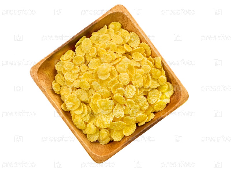 Деревянная миска с сухими хлопьями на завтрак, вид сверху, белый фон