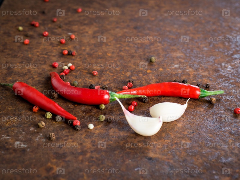 Стручки и горошины красного острого перца чили, зубчик чеснока на темном ржавом металлическом фоне, вид сбоку, крупный план