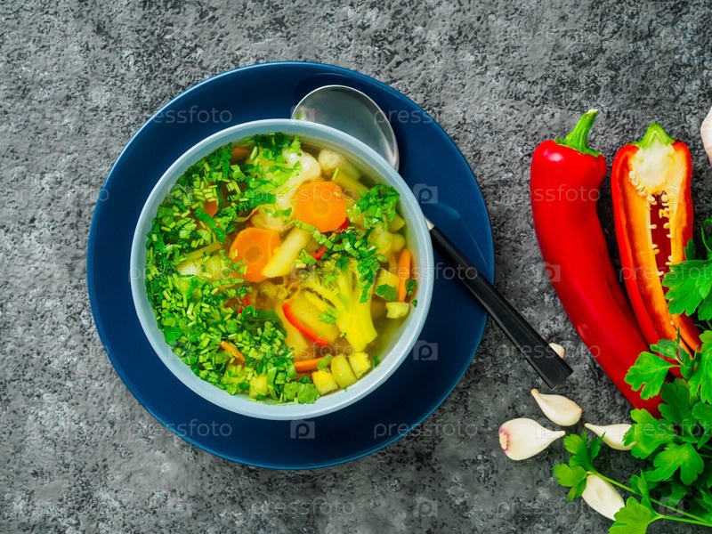 Здоровый весенний овощной диетический вегетарианский суп, серый темный бетонный фон, вид сверху, крупный план