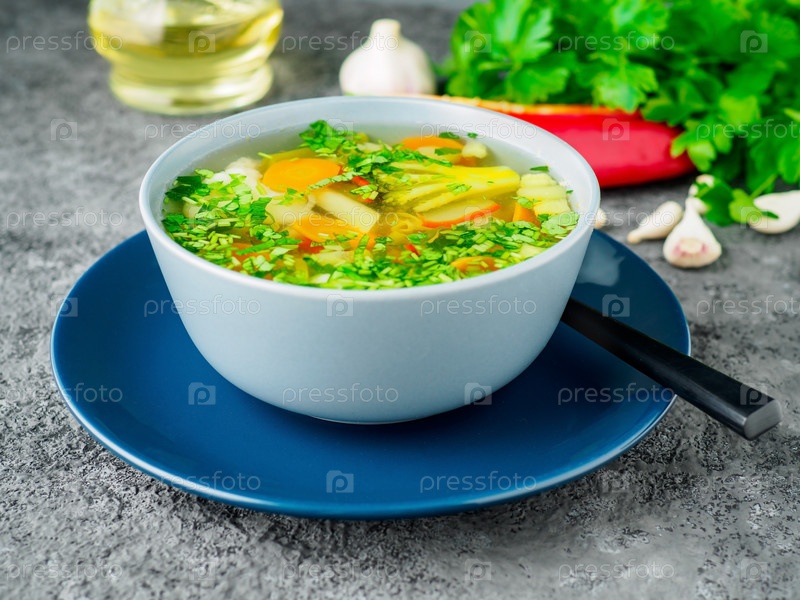Здоровый весенний овощной диетический вегетарианский суп, серый бетонный фон, вид сбоку, крупный план