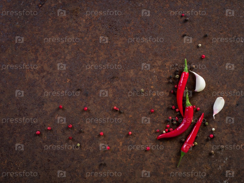 Стручки и горошины красного острого перца чили, зубчик чеснока на темном ржавом металлическом фоне, вид сверху, место для копирования