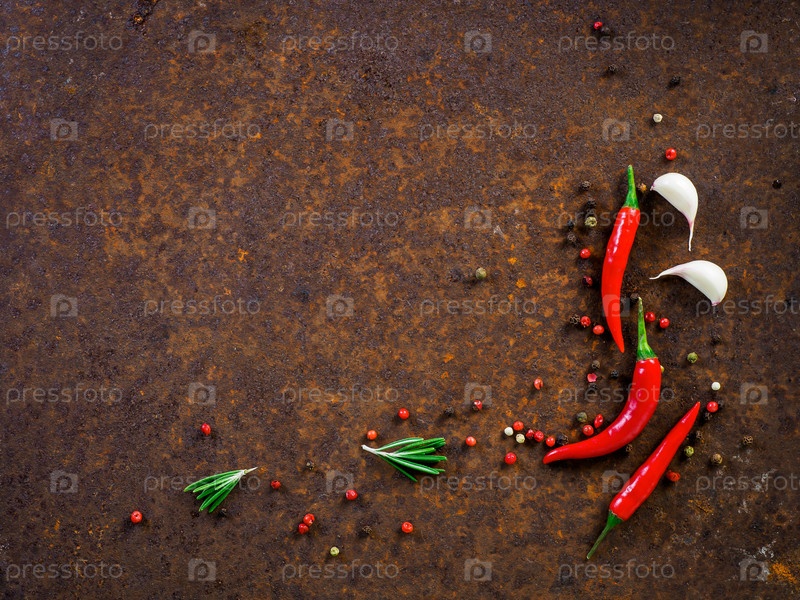 Стручки и горошины красного острого перца чили, зубчик чеснока на темном ржавом металлическом фоне, вид сверху, место для копирования