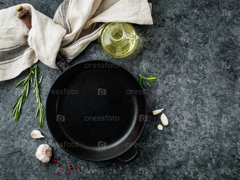 Пустая чугунная сковорода на темно-сером бетонном фоне, вид сверху, пустое место для текста