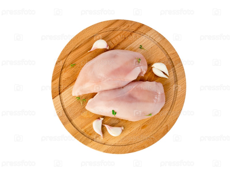 Два куска сырого куриного филе на деревянной разделочной доске, с ломтиками чеснока, вид сверху, изолировано