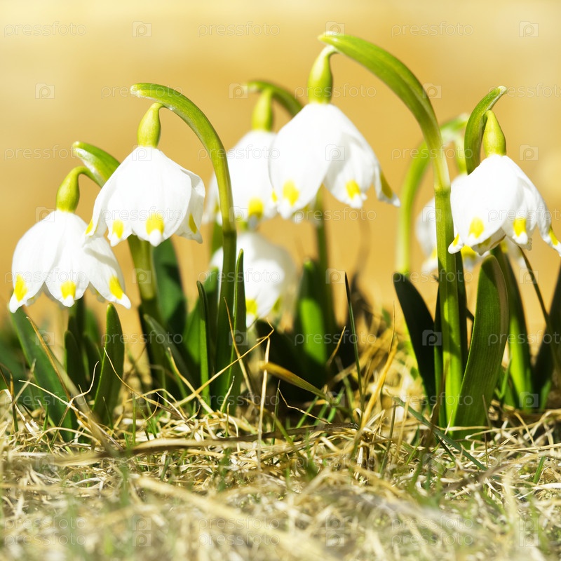 Первые весенние цветы, подснежники на лугу, символ пробуждения природы