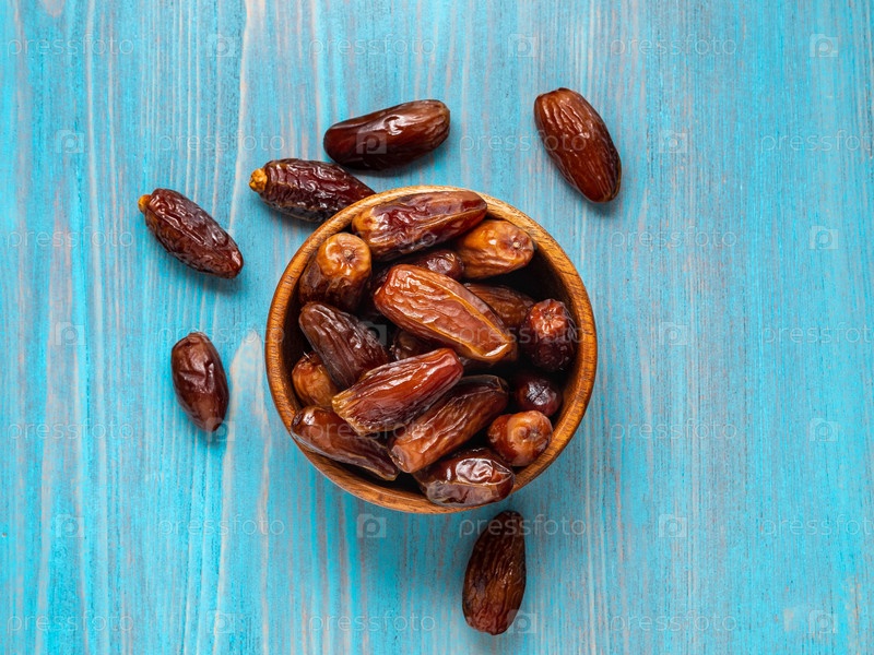 Плоды финиковой пальмы, сухофрукты в деревянной миске. Традиционная еда Ближнего Востока и Северной Африки. Вид сверху, яркий синий деревянный фон