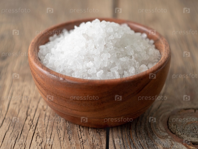 Белая миска с большой морской солью на коричневом ярком деревянном столе. Вид сверху, крупный план, селективный фокус