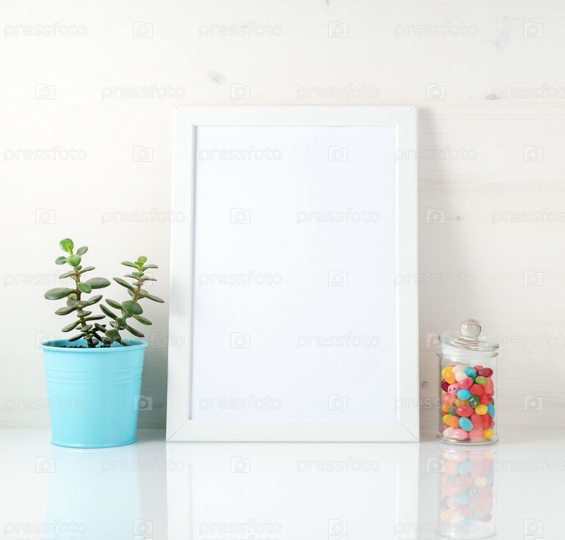 Пустая белая рамка, суккулент в синем горшке, конфеты на белом столе у белой стены. Макет с копировальным пространством в скандинавском стиле