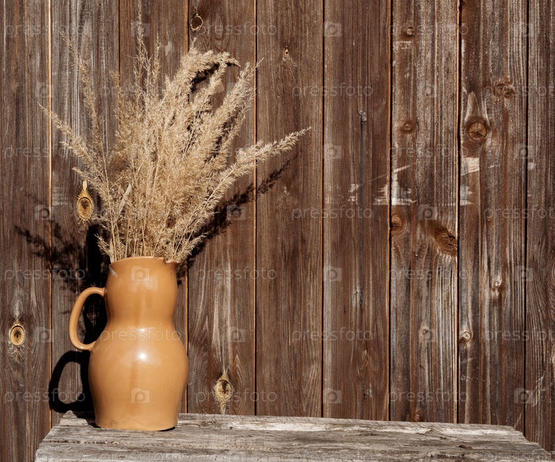 Букет сушеных трав в керамической вазе на деревянном столе перед деревянной старой стеной