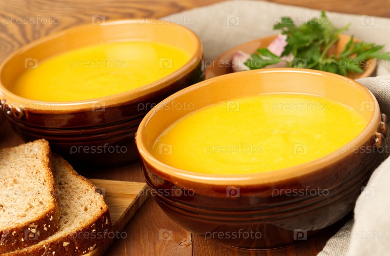 Две коричневые миски тыквенного супа на коричневом темном деревянном фоне, вид сбоку