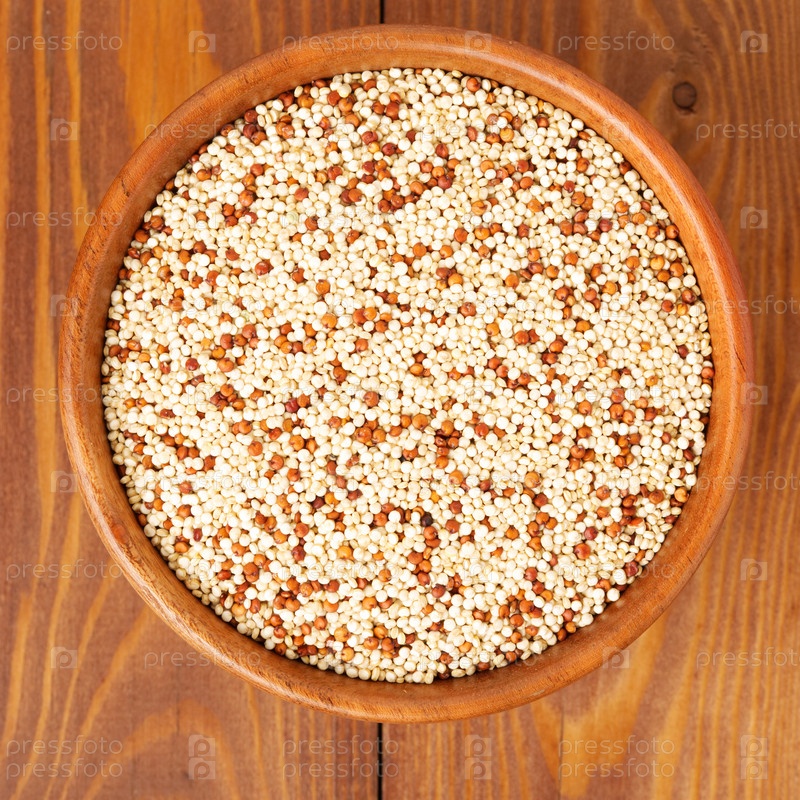 Сырая киноа в деревянной миске, суперфуд. Коричневый деревянный фон, вид сверху
