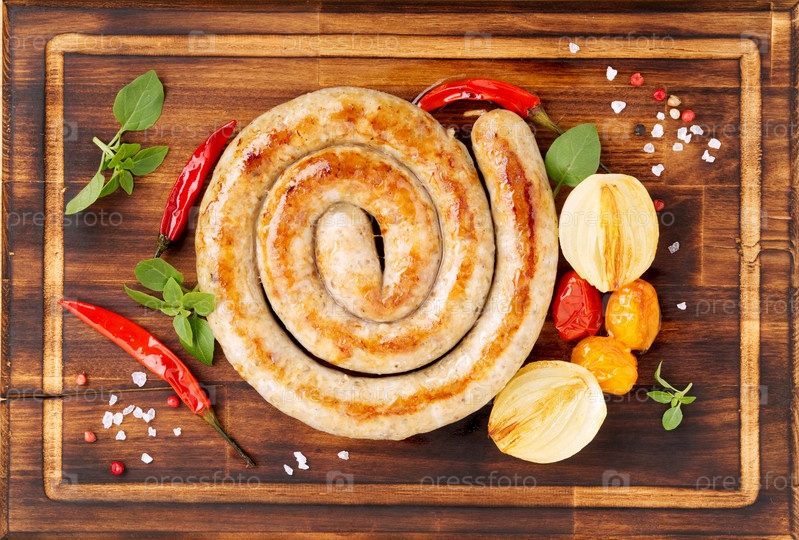 Домашняя жареная колбаса, спиральной формы, с овощами луком, перцем и помидорами на темной деревянной разделочной доске, вид сверху