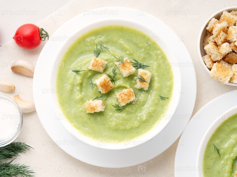 Большая белая миска с овощным зеленым крем-супом из брокколи, цуккини, зеленого горошка на белом