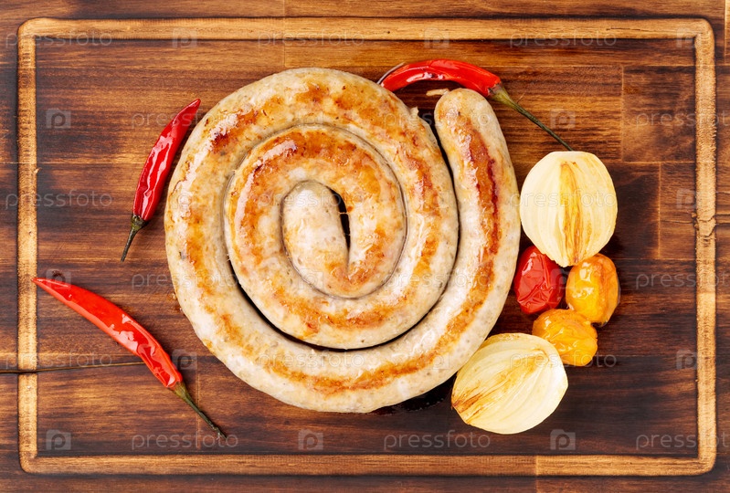 Домашняя жареная колбаса, спиральной формы, с овощами луком, перцем и помидорами на темной деревянной разделочной доске, вид сверху