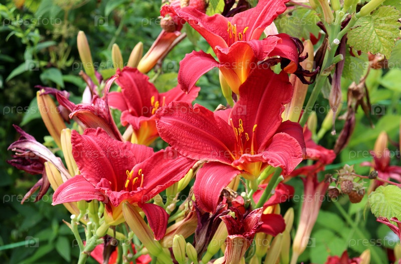Цветущие красные лилии на кусте лилейника на клумбе в саду