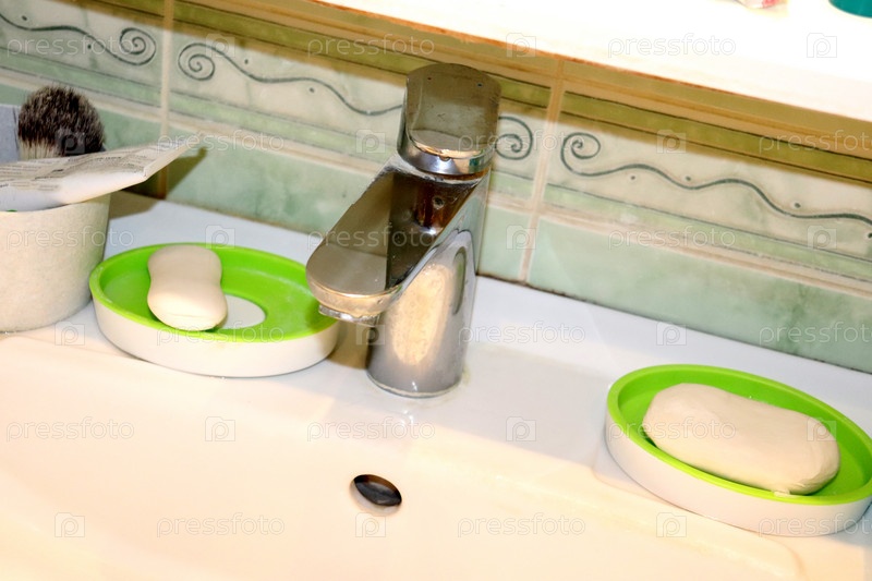 Раковина в ванной с выключенным краном и мылом
