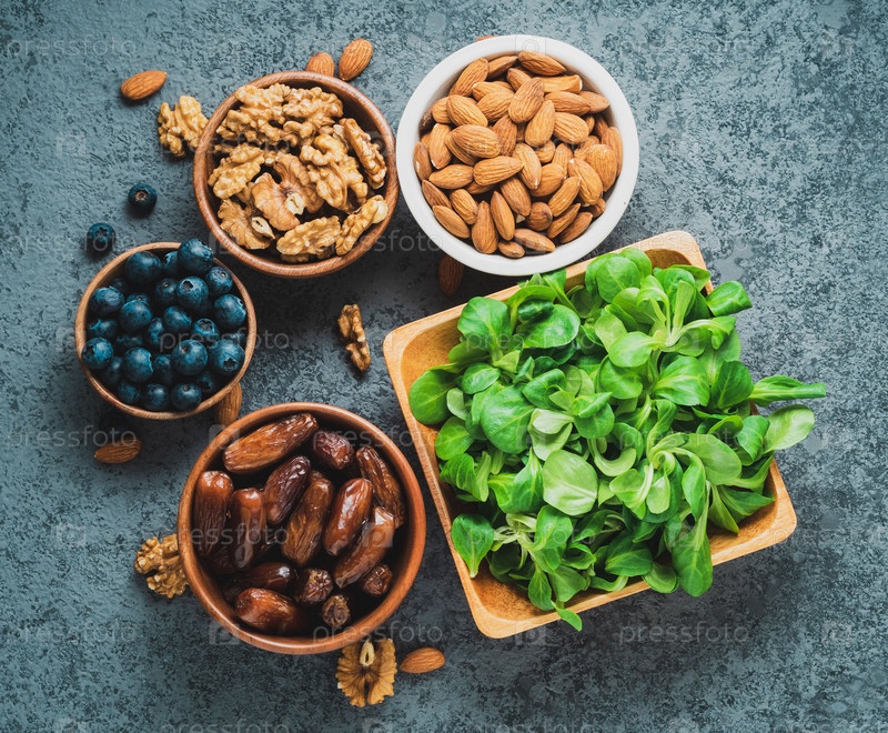 Здоровая веганская еда - сухофрукты, зелень, орехи, ягоды. Суперпродукты на сером каменном фоне, вид сверху