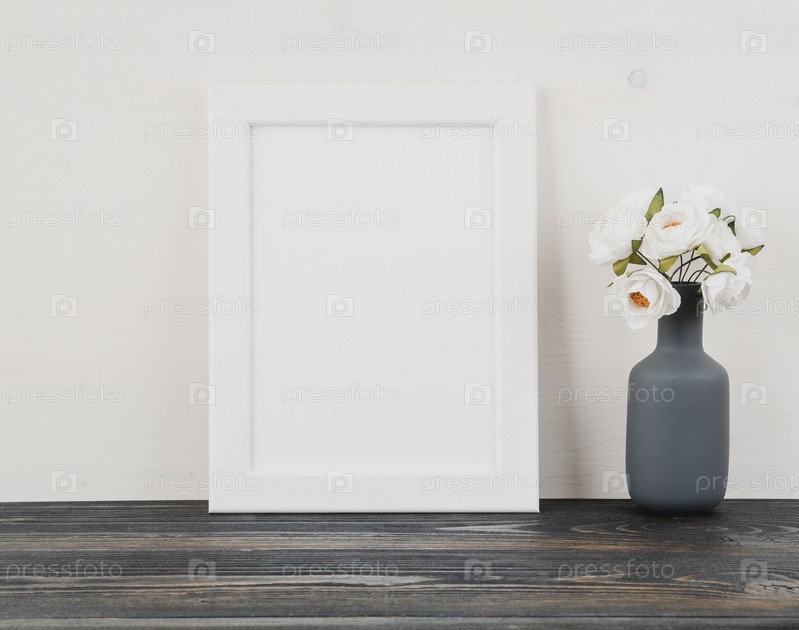 Белая рамка, цветок в вазе, часы на темно-сером деревянном столе на фоне белой стены с местом для копирования. Макет
