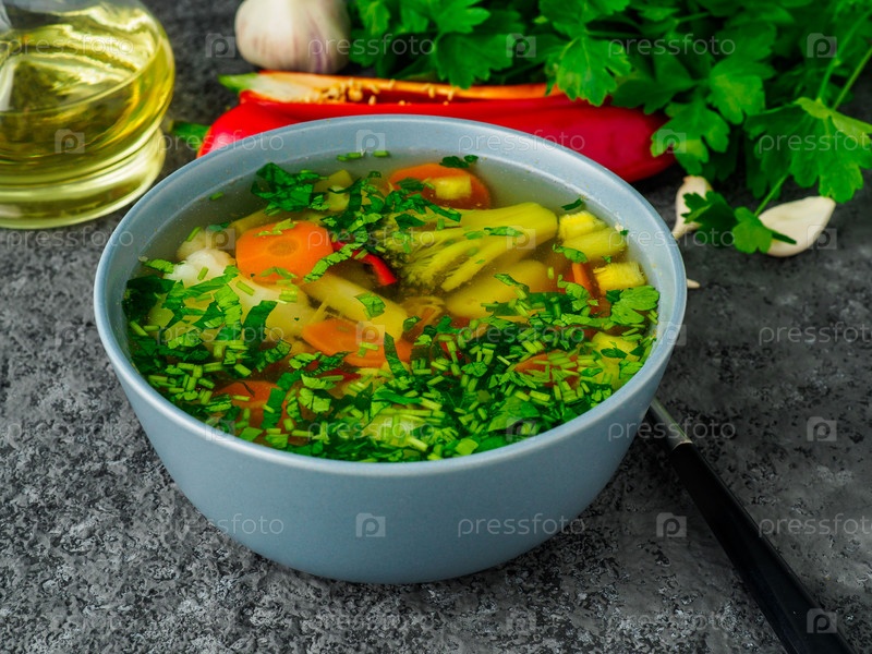 Здоровый весенний овощной диетический вегетарианский суп, серый бетонный фон, вид сбоку, крупный план