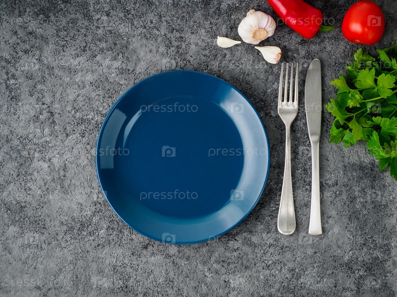Чистая пустая синяя темная тарелка, вилка и нож на сером бетонном фоне, вид сверху