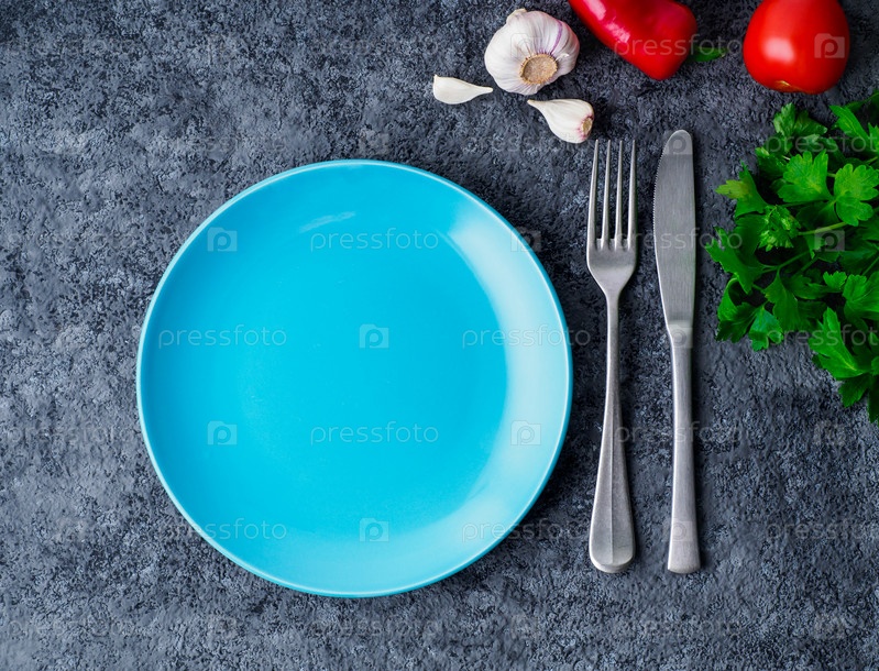 Чистая пустая синяя яркая тарелка, вилка и нож на сером бетонном фоне, вид сверху