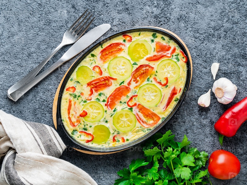 Сковорода с традиционной итальянской фриттатой на темно-сером каменном столе, вилки, петрушка, перец, помидоры. Яичница-болтунья