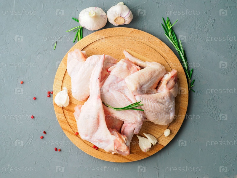 Сырые свежие куриные крылышки на деревянной доске, серый бетонный фон, вид сверху