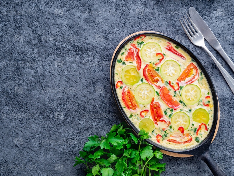 Яичница-болтунья с миксом разноцветных овощей. Красивый аппетитный ужин. Вид сверху, крупный план, темный каменный стол