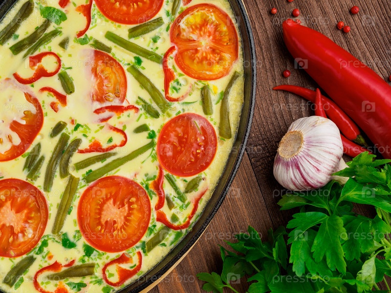 Часть чугунной сковороды с яичницей, помидорами и другими овощами. Крупный план, макро, деталь, вид сверху