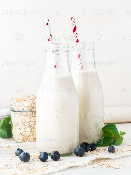 Смузи с овсянкой, мятой для здорового завтрака. Овсяное молоко в стеклянной бутылке с трубкой на белом фоне
