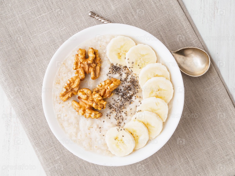 Здоровый завтрак - овсянка с орехами, бананами, чиа, вид сверху