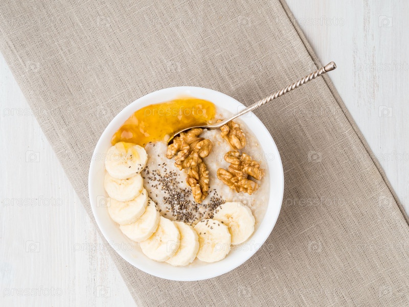 Здоровый завтрак - овсянка с орехами, бананами, чиа, вид сверху, крупный план