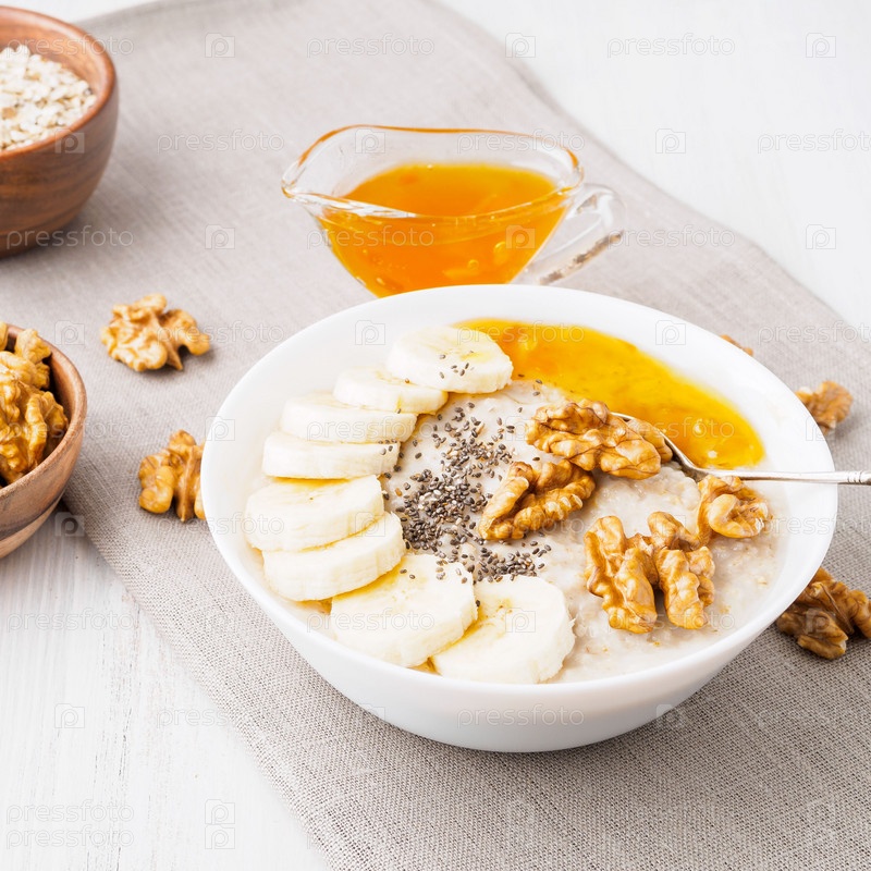 Здоровый завтрак - овсянка с орехами, бананами, чиа, вид сбоку, крупный план