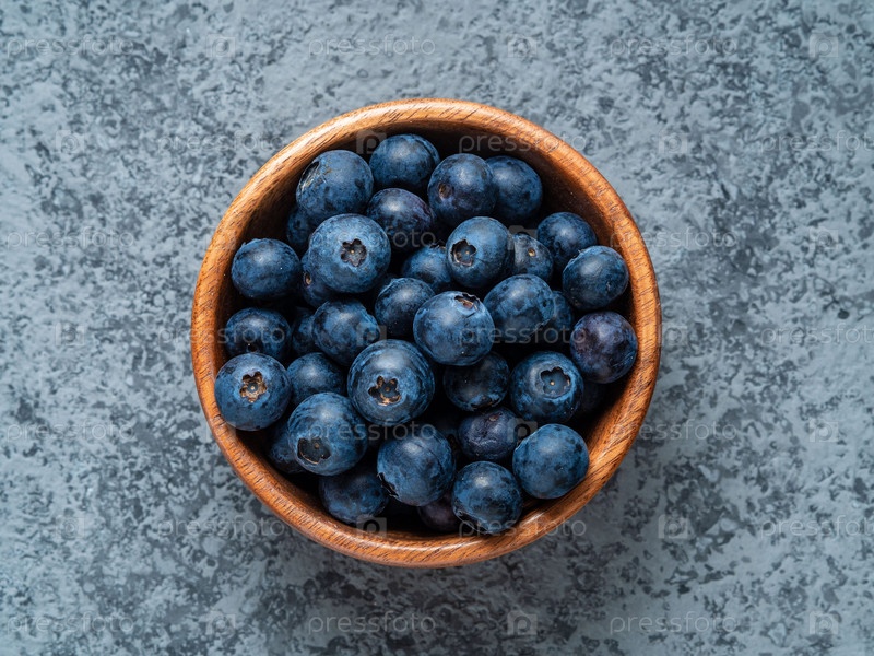 Черника в деревянной миске на темно-сером каменном столе, вид сверху