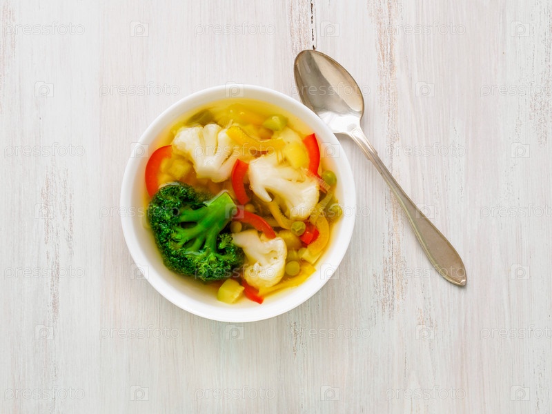 Яркий весенний овощной диетический вегетарианский суп с цветной капустой, брокколи, перцем, морковью, зеленым горошком, петрушкой. Вид сверху, белый деревянный фон