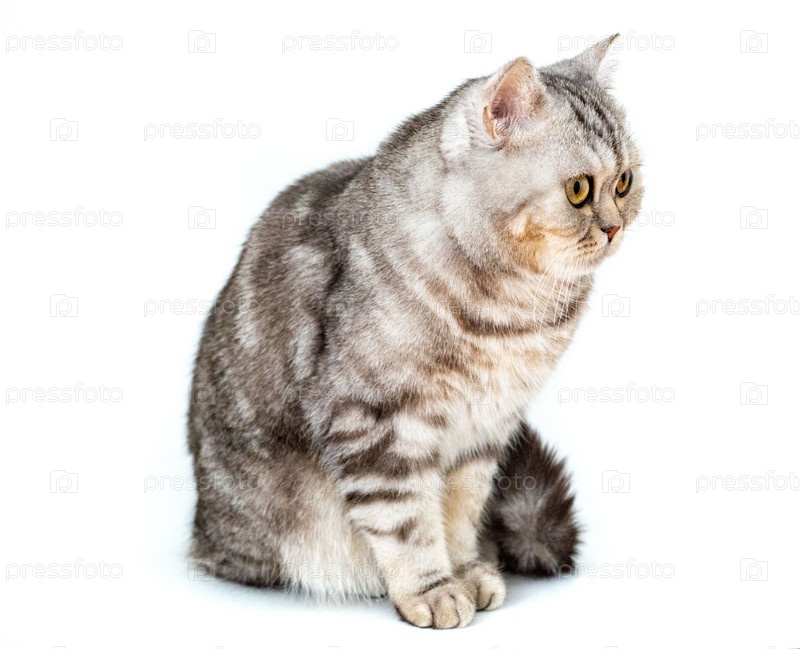 Красивая полосатая кошка сидит на белом фоне