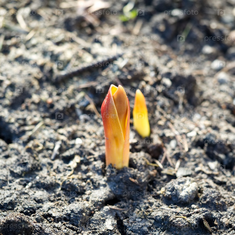 Желтые цветочные ростки, растущие из почвы в утреннем свете