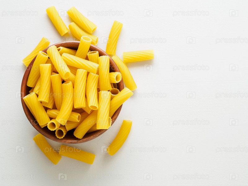 Паста Тортильони в деревянной миске на сером каменном столе. Вид сверху, пустое место для текста