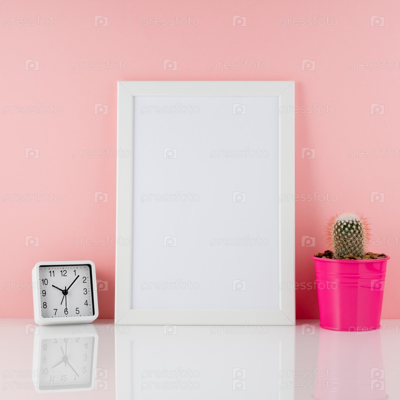 Пустая белая рамка, кактус в розовом горшке снова на белом столе
