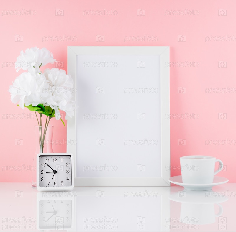 Пустая белая рамка, цветок, часы, чашка кофе или чая на белом столе на фоне розовой стены с местом для копирования. Макет