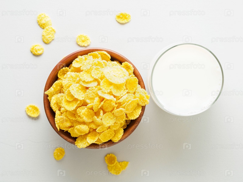 Деревянная миска с сухими хлопьями на завтрак, чашка молока, вид сверху, серый фон