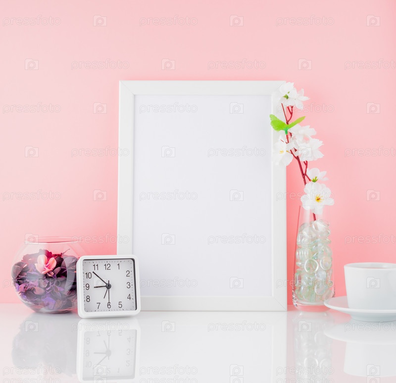Чистая белая рамка, цветок, часы и чашка кофе или чая на белом